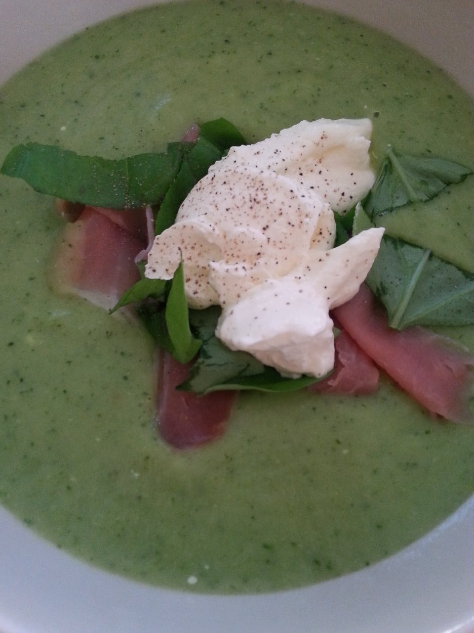 Nu kun je je gerechtje gaan opmaken. Schep wat van de soep in een kom en verdeel hier wat van de ham overheen. Tot slot doe je er een lepeltje crème fraîche en wat basilicum overheen. Ook kun je natuurlijk nog wat peper over de soep strooien.